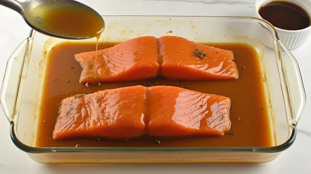 For Oven Method: Place the marinated salmon fillets on a parchment-lined baking sheet, skin-side down. Bake for 12-15 minutes, basting with the reserved glaze halfway through. The salmon is ready when it flakes easily with a fork but still maintains a slightly translucent center for optimal moisture.